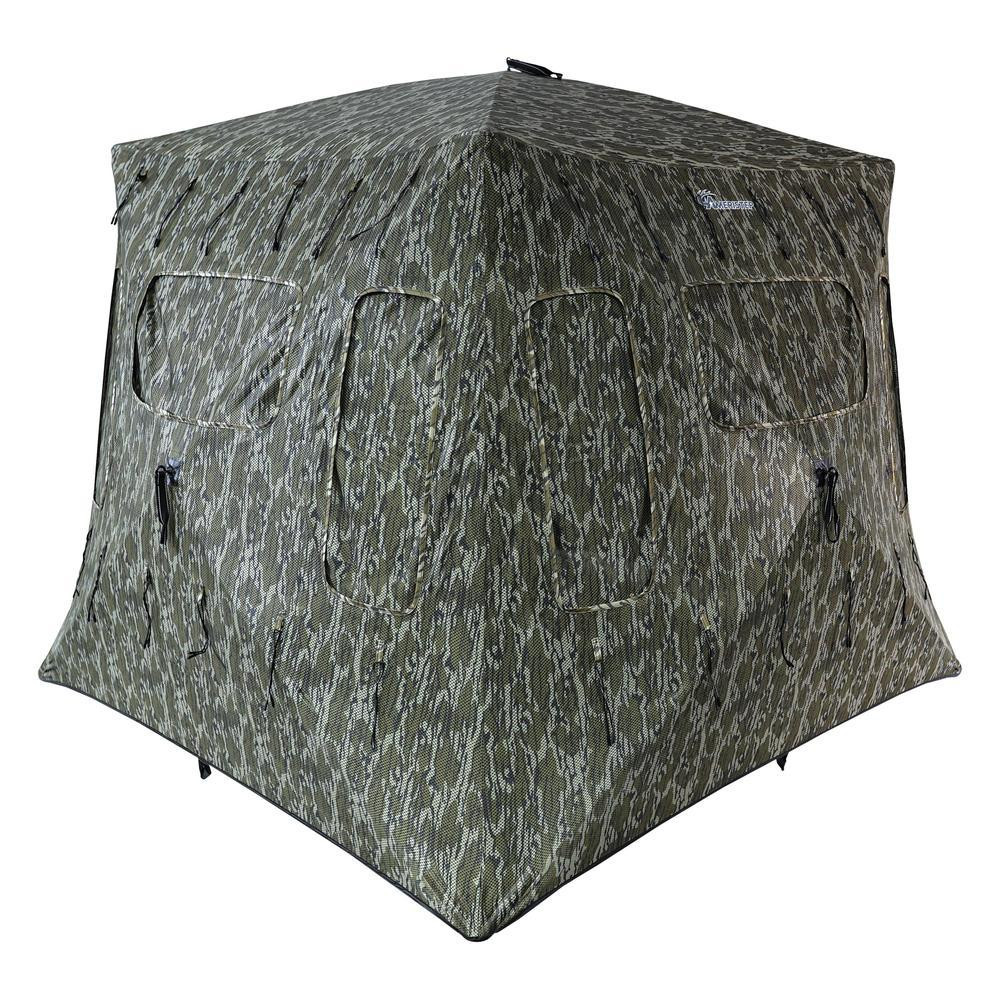The Frontline Wide-Bottom Extreme hub-style blind features a roomy footprint with space enough for up to three hunters, but it also includes Extreme View mesh with a silent sliding window system for all six windows. Four of those windows, designed specifically with bowhunters in mind, deliver an expansive 180° view, while two peek windows keep users informed at all times. A shadow-eliminating ShadowGuard™ coating breaks up silhouettes to keep you hidden once inside. Its rugged 300-denier fabric shell with matte finish pairs with Mossy Oak Bottomland camouflage to help you blend into your surroundings while ensuring long-lasting protection, thanks to a roof that’s 100% waterproof.
