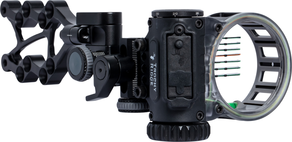 Lighter, stronger, and more reliable, the Trophy Ridge React 7 Max bow sight is engineered to deliver speed, precision, and durability for serious bowhunters. Designed to help you make fast, accurate shots, it features React Technology that automatically adjusts all seven pins for optimal placement. The speed-select dial lets you quickly fine-tune the sight for different arrow speeds and distances, while the rechargeable integrated LED module provides bright, consistent illumination. Its smoked gray polycarbonate housing and subtle gray accents give the sight a modern, low-profile look, and rubber-coated knobs ensure a quiet, comfortable grip in any weather. The React 7 Max is a top-tier sight built to perform in the field.