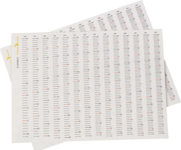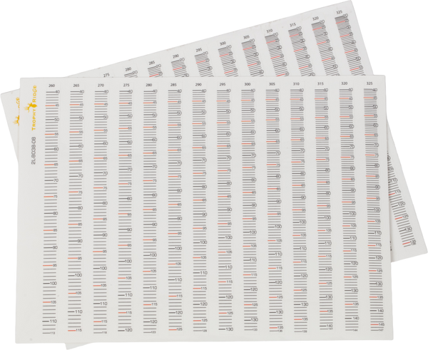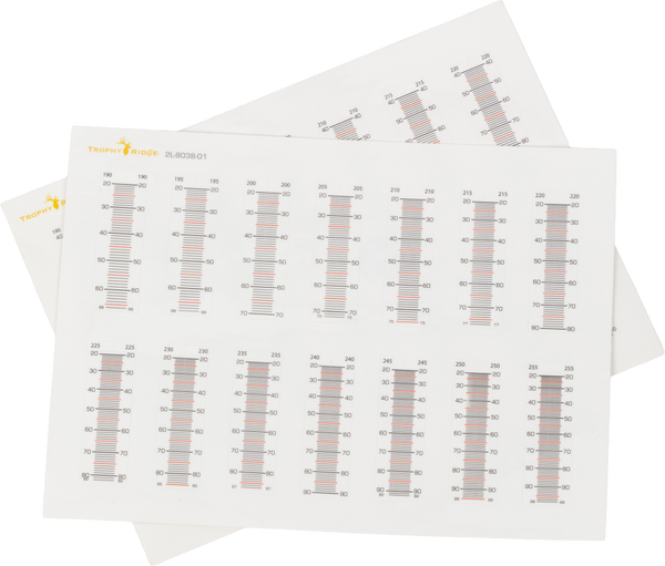 Achieve consistent, to the yard accuracy with Trophy Ridge Sight Tapes. This pack includes 8 sheets of sight tapes, featuring 4 pages of vertical tapes and 4 pages of wheel tapes. Available in right- or left-hand packs, these self-adhesive, weather resistant tapes are a universal fit for most vertical mover sights. The tapes are calibrated for precision at multiple distances. Vertical tapes start at 20 yards (190325 FPS) and 40 yards (190325 FPS), while wheel tapes start at 20 yards (190325 FPS) and 40 yards (190325 FPS). Simply apply the tapes to your sight, sight in at 20 or 40 yards to establish your first point, then step out to longer distances to add a second point. Each tape also includes speed estimates to help you quickly select the right tape for your bow.