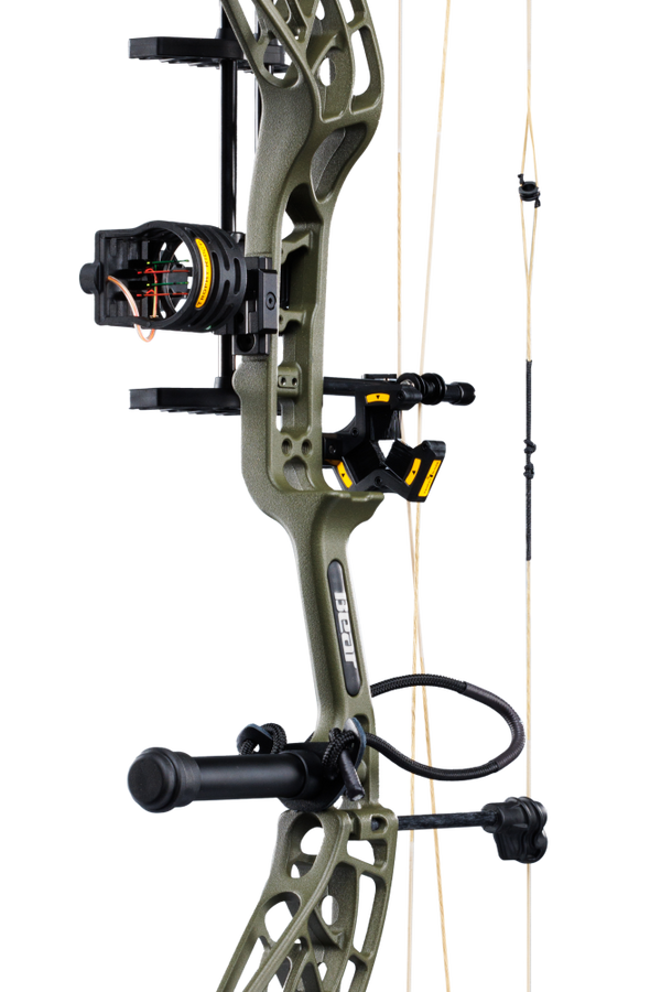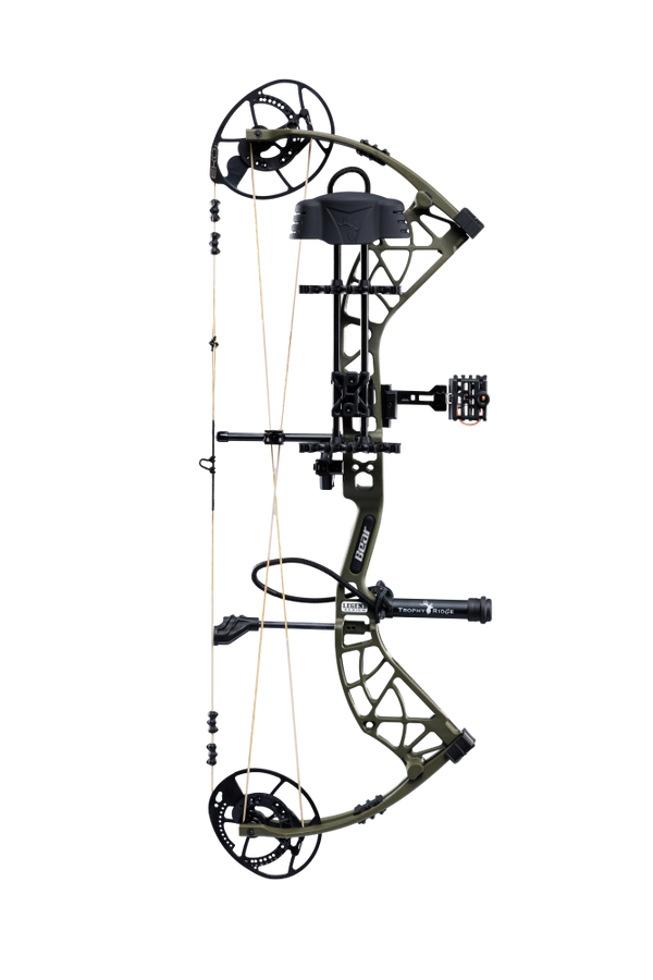 The Bear Whitetail is a cornerstone in compound bow history, and to continue this legacy we are proud to launch the Whitetail INT. Featuring the EKO cam system, this bow is capable of speeds up to 339fps, while offering the shooter up to an ultra-comfortable 90% let-off. This bow features the ultimate Ready-To-Hunt package from Trophy Ridge with an IMS V-Biscuit rest, a Picatinny-mounted 4 pin sight, a 5 arrow quiver, a stabilizer, Tru peep sight, and wrist sling! Packed with high end features, the Whitetail INT also includes a new roller cable guard system to provide an ultimate smooth draw. KillerWave limb dampeners are in place to make this bow seemingly dead on the shot. With a 6.5" brace height, 31" axle-to-axle and an adjustable draw length from 26-30 inches, this is the ultimate bow for almost anyone.
