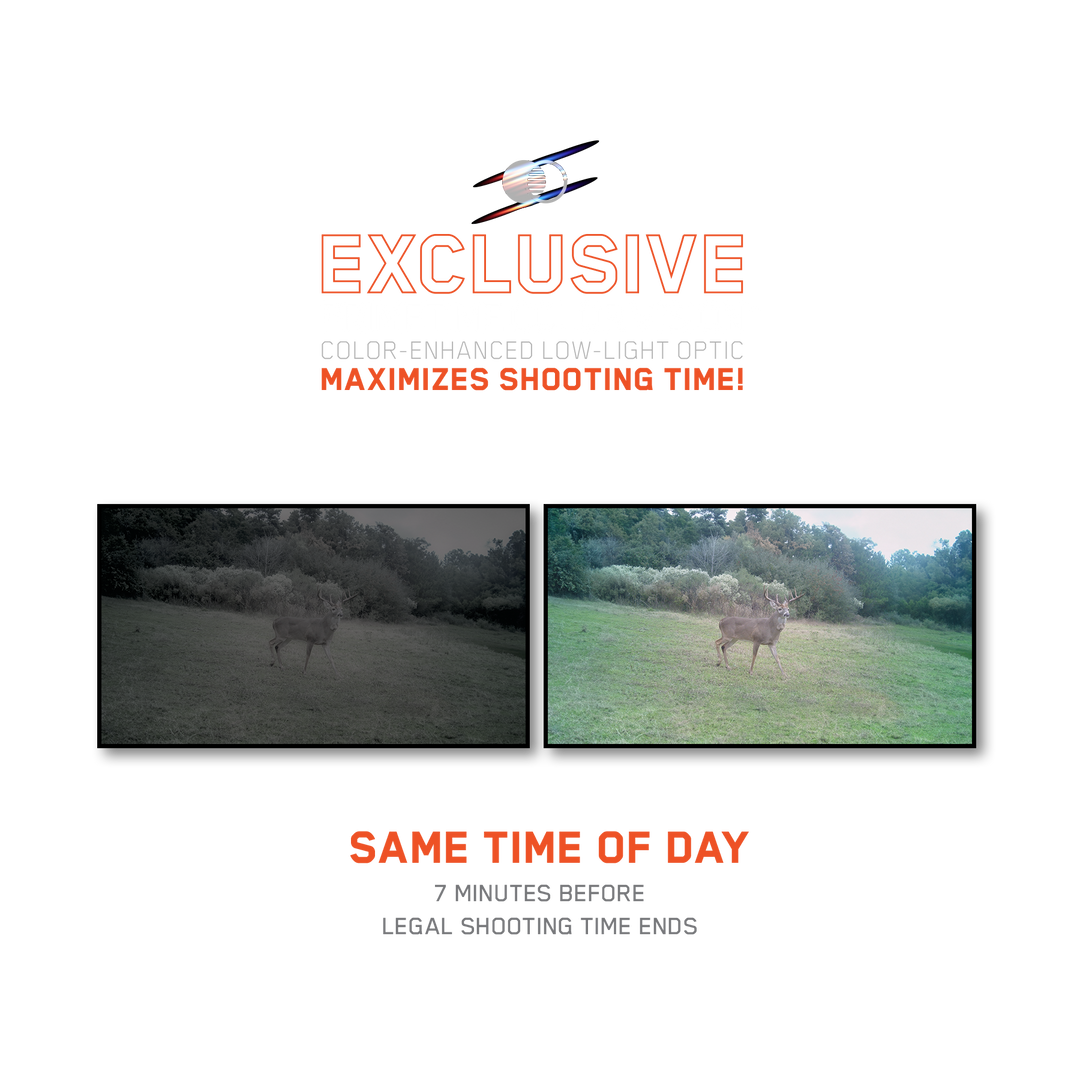 Buknoculars features an industry first technology, Primetime Color Vision™. This patent pending technology drastically enhances low-light conditions to maximize every moment of shooting time. Quickly identify your target buck in vivid color when traditional optics only provide a graying silhouette. Primetime Color Vision™ does NOT use thermal imaging NOR infrared, it is its own proprietary technology unlike any other! Add a set of Buknoculars to your optics arsenal and make primetime count.